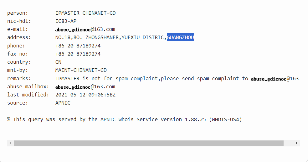 Using whois.com, I typed in the suspicious IP address of 14.0.0.120 and got the information in the screenshot below.