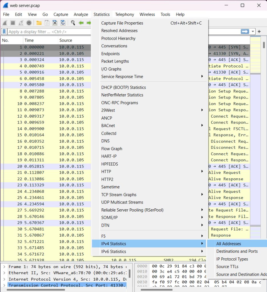 I was able to see that the IP address for the server was 10.0.0.112. Notice in the green box (the box on the left) that the IP address of 14.0.0.120 is communicating with the server in an odd way. In the yellow box (the box on the right) I saw that it is sending packets to different ports on the server in a way that no other IP address was doing, which is why I identified it as the suspicious IP address.