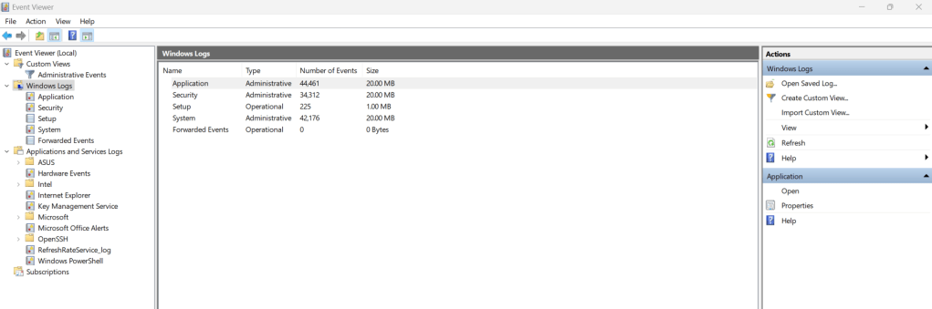 Windows Event log provide a record of specific user and system action, to include logon/ logoff activity, account creation, start/stop status of services and more. The event logs are stored in a binary format and either needs to be viewed in a third party application or with Windows Event Viewer that come built into the Window OS as seen below.